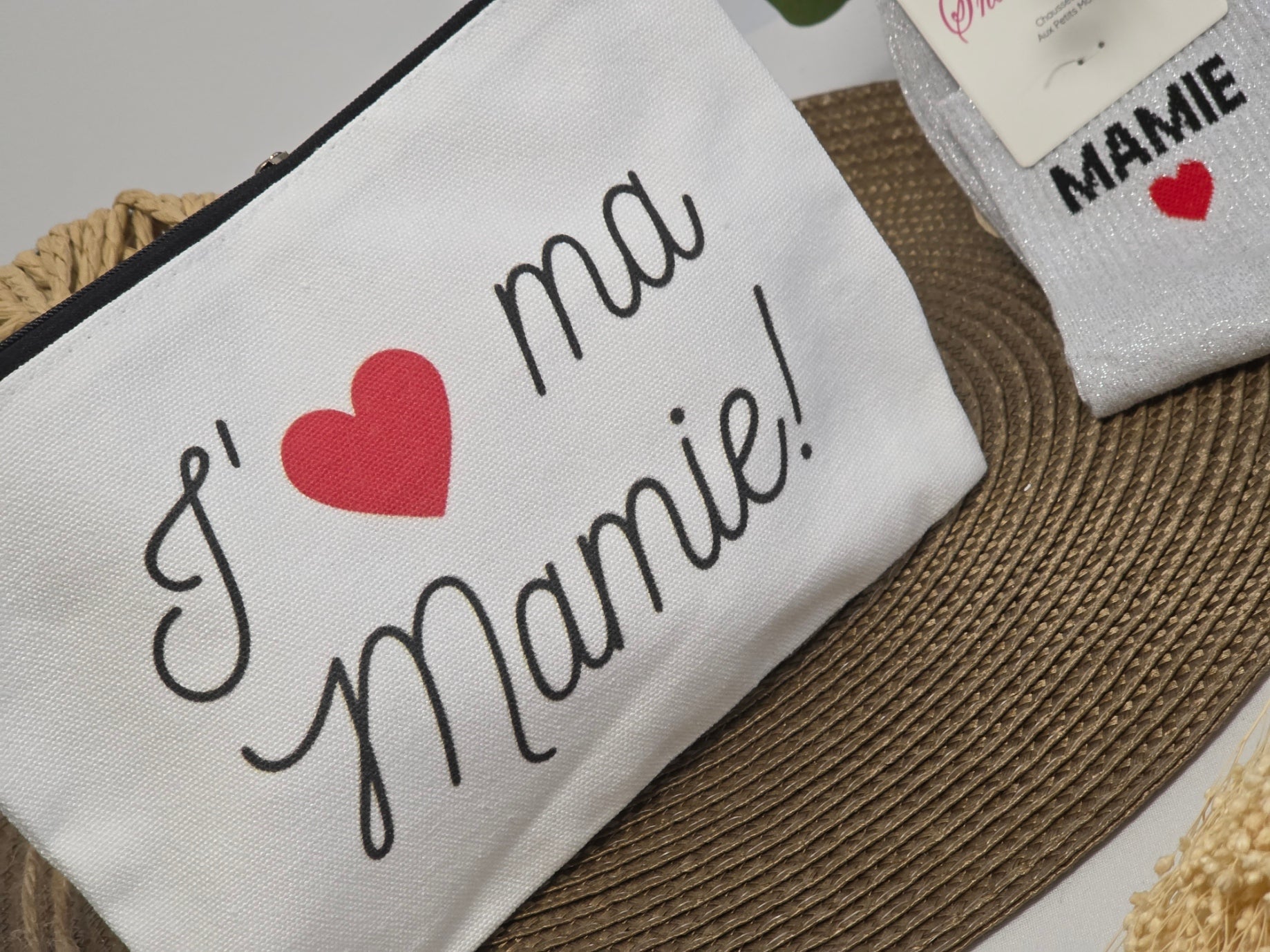POCHETTE " J'AIME MA MAMIE " AVEC SA CHAUSSETTE PAILLETEE GRISE