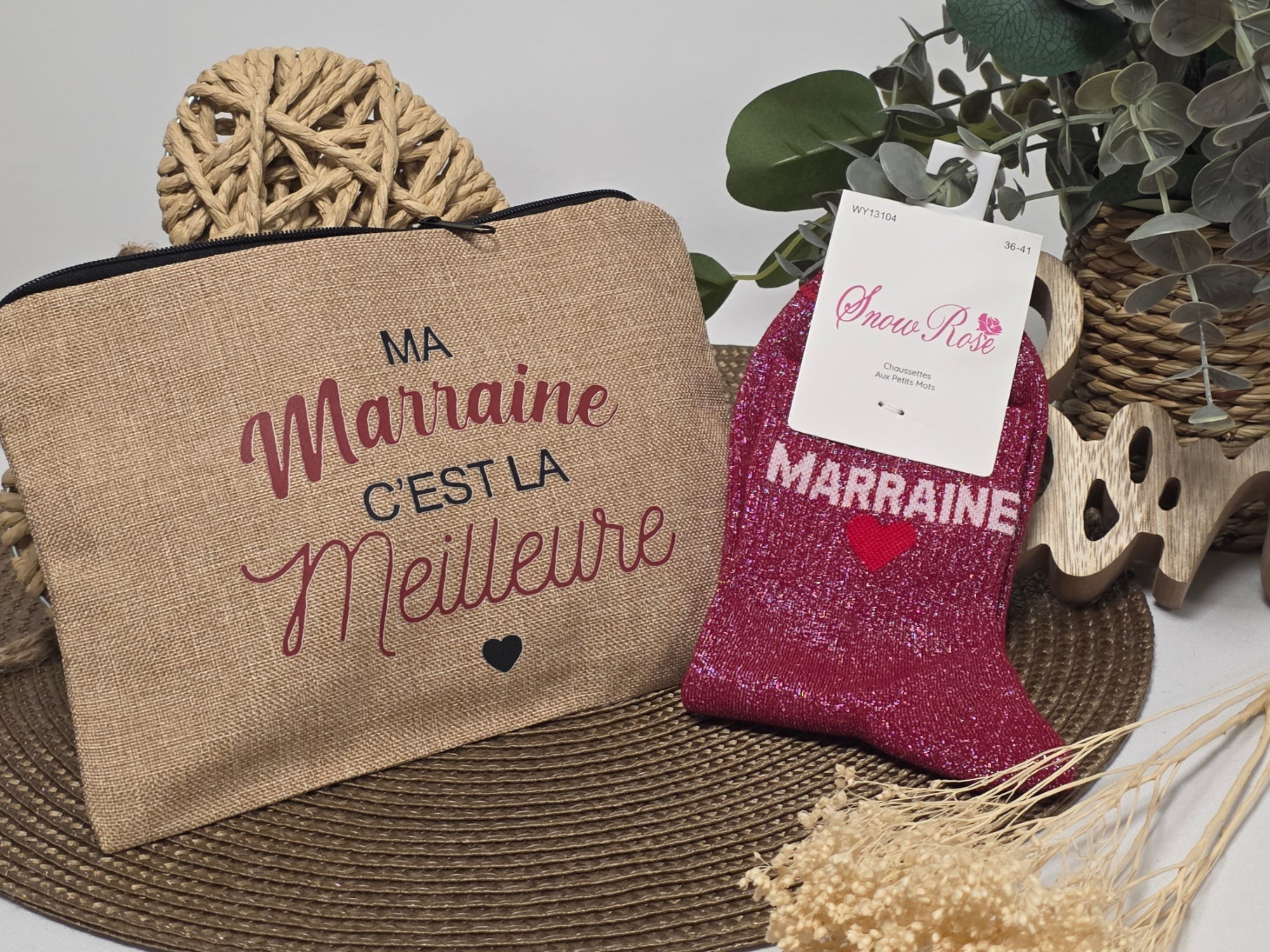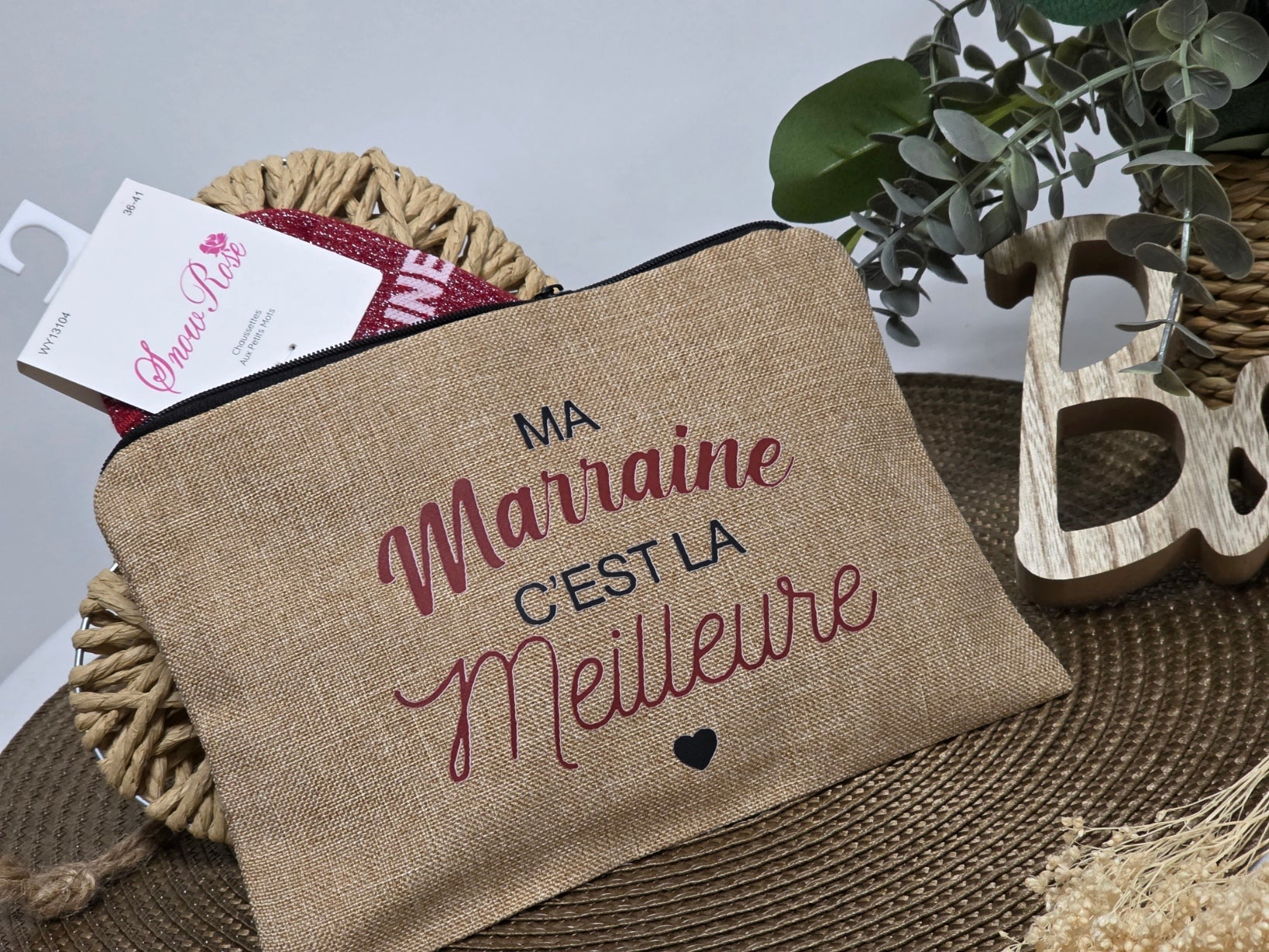 POCHETTE " MA MARRAINE C'EST LA MEILLEURE " AVEC SA CHAUSSETTE PAILLETEE BORDEAUX