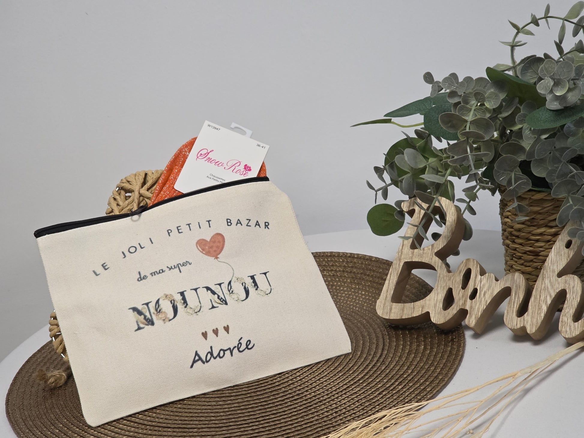 POCHETTE " NOUNOU ADOREE" AVEC SA CHAUSSETTE PAILLETEE ORANGE